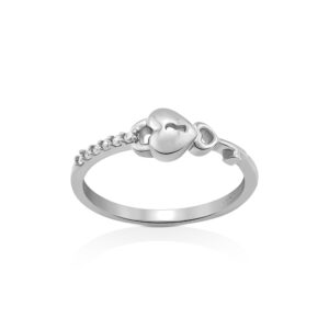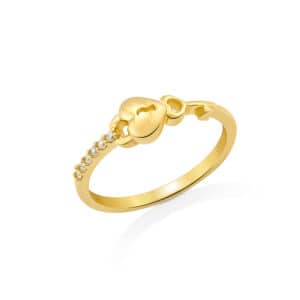 Nyla ring features a unique design inspired by the classic padlock shape with a heart motif representing the precious bond between two individuals, add features decorated with round cut cubic zirconias on the sides. Celebrate the season of love with our enchanting Valentine Collection ring, and wear it as a heartfelt declaration of love or present it as a treasured gift to express your affection.