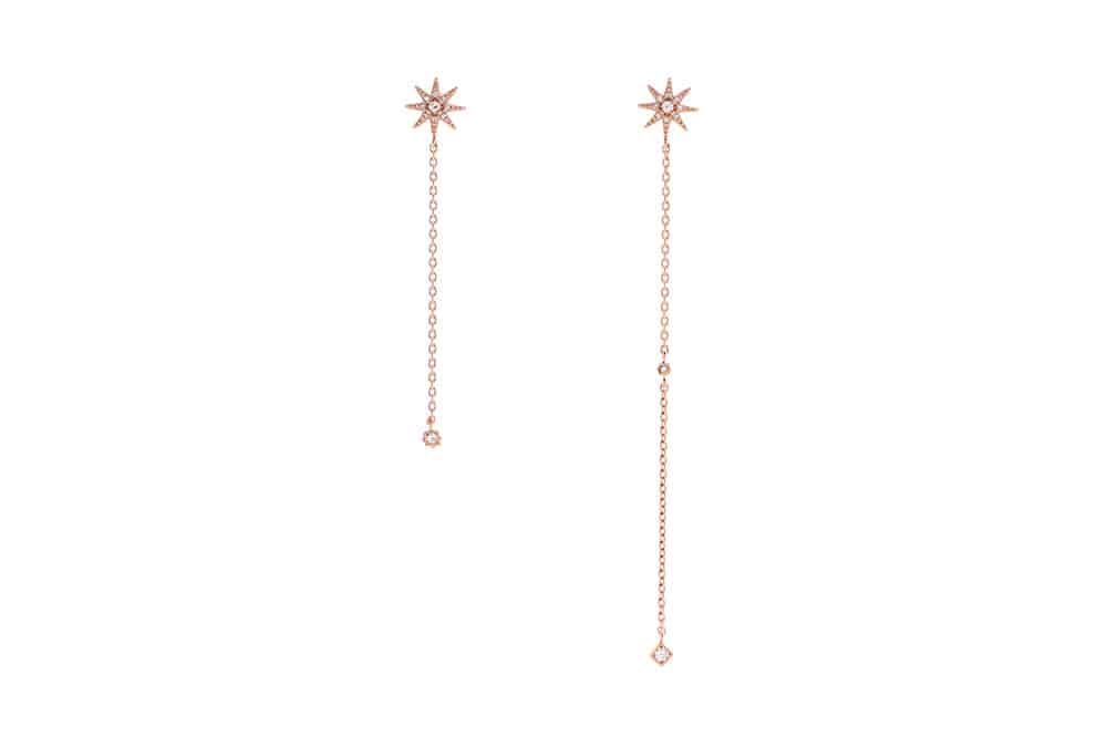 ต่างหูทรงระย้าที่โดดเด่นที่แตกต่างด้วยความต่างระดับของต่างหูทั้ง2ด้าน ได้รับแรงบันดาลใจในการดีไซน์จากฝนดาวตก เหมาะแก่การสวมใส่ในวันที่ต้องการความโดดเด่นเป็นพิเศษไม่ว่าจะเป็นการพบปะผู้คนเยอะๆในงานเลี้ยงหรืองานเฉลิมฉลองต่างๆ ส่วนต่างหูทั้งหมดผลิตจากSterling silver 925 ตกแต่งด้วยพลอย Cubic Zirconia ขนาด 2.5 mm จำนวน 2 เม็ด ,ขนาด 2.00 mm. จำนวน 1 เม็ด , ขนาด 1.5 mm. จำนวน 2 เม็ด, ขนาด 1.25 mm จำนวน 1 เม็ด , ขนาด 1.00 mm. จำนวน 16 เม็ด มีให้เลือกทั้งหมด 3 สีชุบ ได้แก่ สีเงิน (ชุบทองคำขาว) ,สีทอง (ชุบทอง 14k) และสีโรสโกลด์