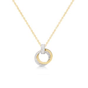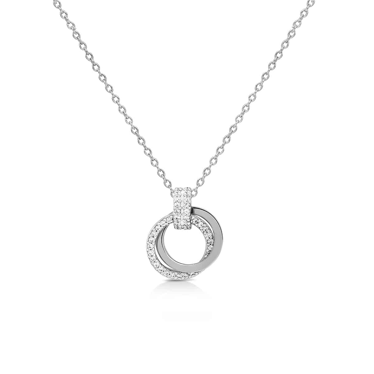 สร้อยคอดีไซน์ห่วงกลมซ้อนกัน แสดงถึงความรักอันเป็นนิรันดร์ หรือแสดงถึงความผูกพันธ์ที่มีให้กัน โดดเด่นทั้งดีไซน์และความหมาย ประดับพลอย CZ เพิ่มความหรูหราโดดเด่นให้กับคุณ