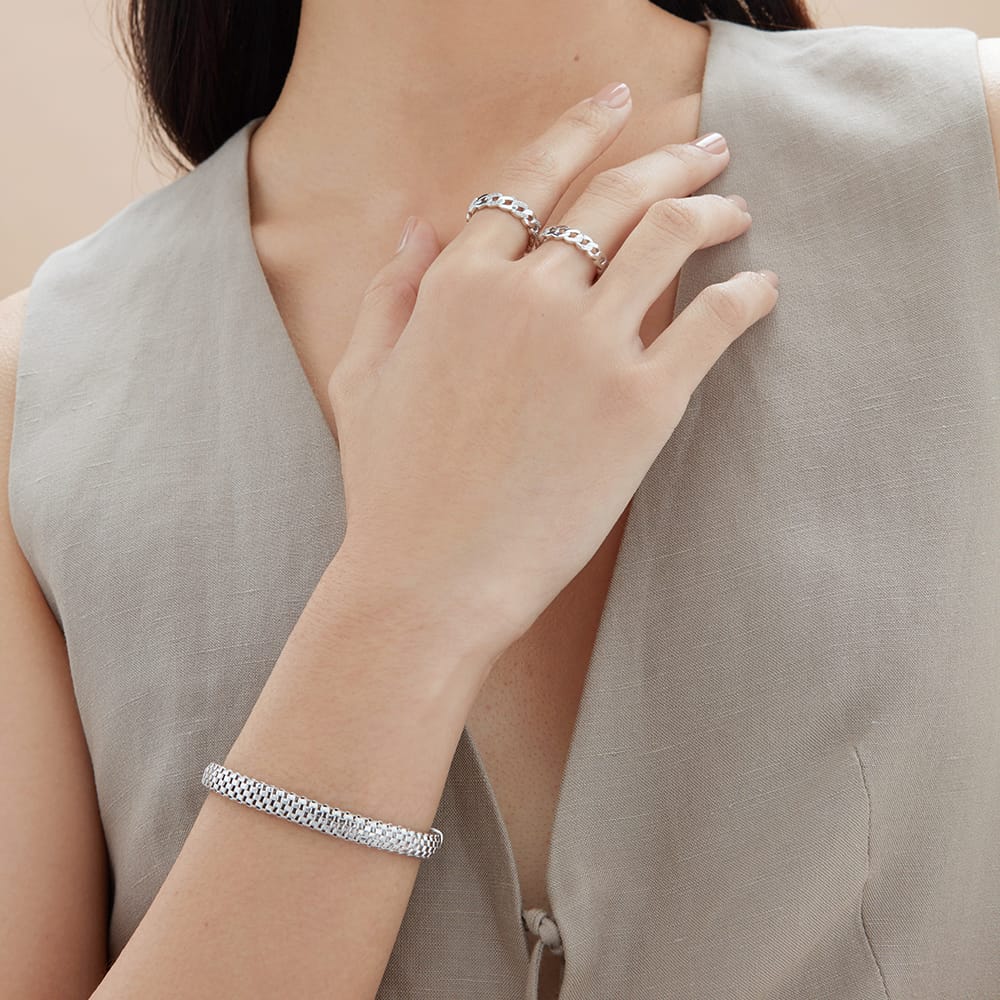 แหวนดีไซน์ลายโซ่ร้อยเรียงกัน ได้กลิ่นอายความเป็นสตรีทแฟชั่น ได้ทั้งลุคเท่เก๋ไม่เบา จะใส่กับลุคไหนก็ช่วยเพิ่มความชิคโดดเด่นไม่แพ้ใคร