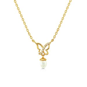 สร้อยคอดีไซน์ผีเสื้อที่สวยงามสื่อถึงความหมายที่ดีในการเริ่มต้นใหม่ การเปลี่ยนแปลง และความเป็นอิสระเพิ่มความเปล่งประกายด้วยการประดับพลอย Cubic Zirconia และความหรูหรามากยิ่งขึ้นด้วยจี้ไข่มุก สร้อยคอรุ่นนี้จึงเหมาะที่จะใส่ในวันพิเศษของคุณ เพื่อเพิ่มความมีเสน่ห์ให้กับผู้ที่สวมใส่
