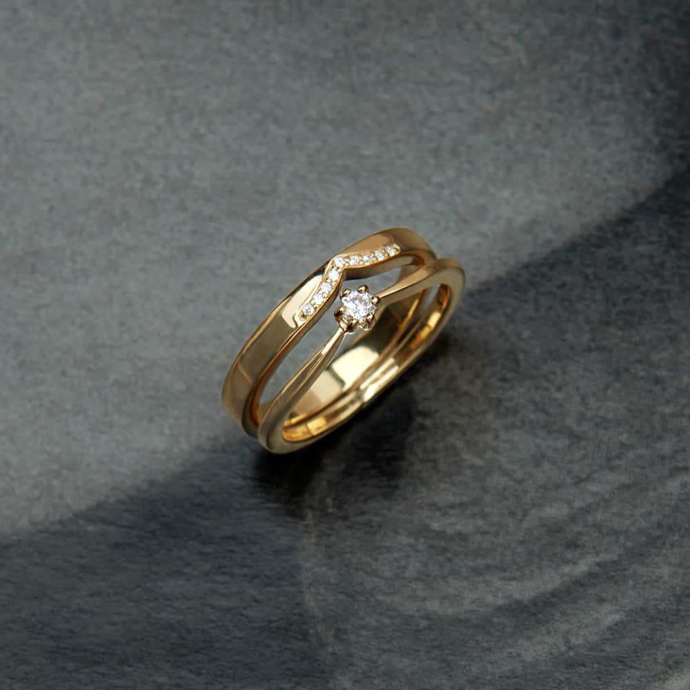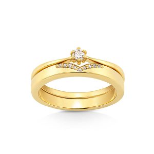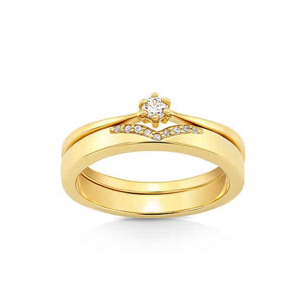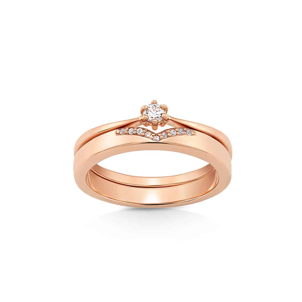 แหวนที่ตั้งใจดีไซน์ออกมาให้สามารถประกบกัน 2 วง จะใส่เดี่ยว ใส่คู่ หรือใส่กับคนที่คุณรักก็ลงตัวสุดๆ ด้วยดีไซน์ที่เข้ากัน วงเล็กประดับด้วยพลอยขนาด 2.5 mm. ส่วนวงใหญ่ประดับพลอย CZ เรียงกันเป็นแนวตัว V เมื่อนำมาประกับกันเสมือนดอกไม้ที่เบ่งบาน เป็นความหมายดีๆที่มอบให้แก่กัน