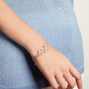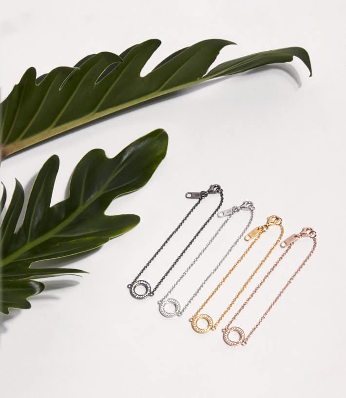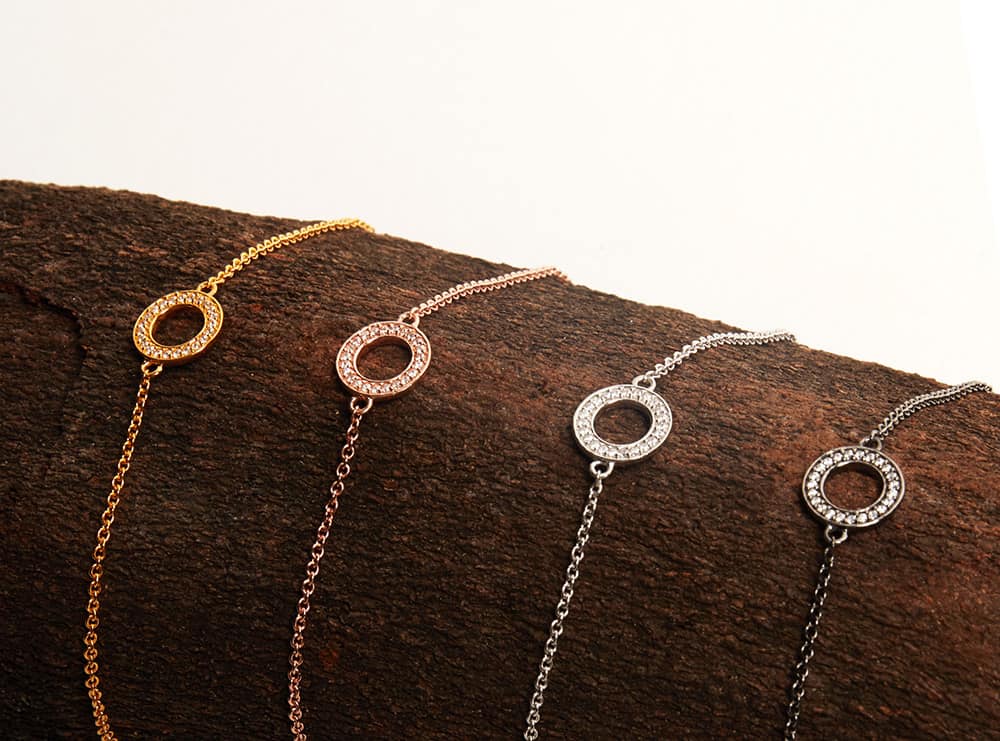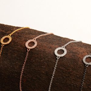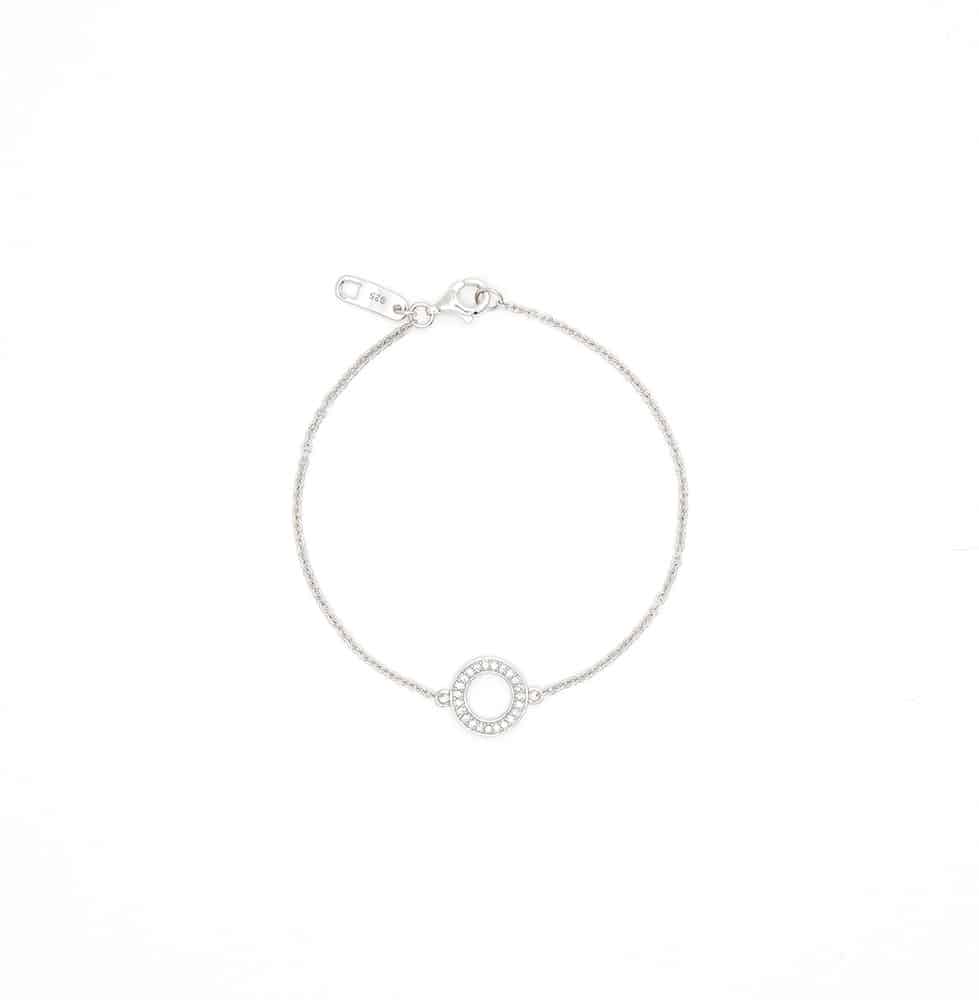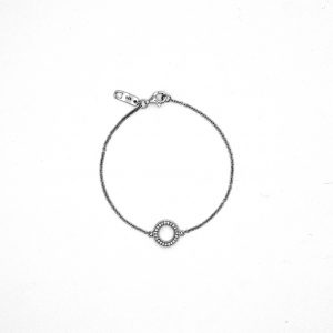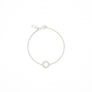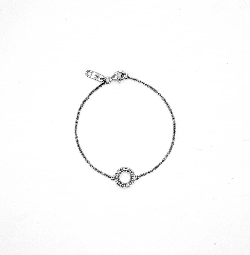 สร้อยข้อมือเงินแท้ รุ่น Nicole ดีไซน์ตกแต่งด้วยรูปทรงเรขาคณิตวงกลมพร้อมประดับตกแต่งด้วยพลอย Cubic Zirconia ขนาด 1.10 mm. ความยาวของสร้อย 15 cm.เพิ่มเติมลูกเล่นบริเวณข้อต่อไม่ซ้ำใครด้วยการร้อยป้ายแท็ก