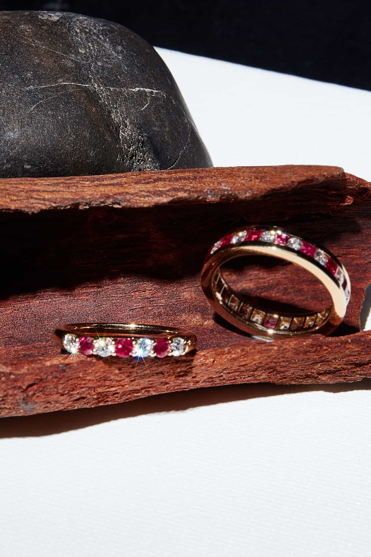แหวนสไตล์คลาสสิคเรียบง่าย เพิ่มเติมความหรูหราด้วยการตกแต่งอัดแน่นไปด้วยพลอย โดยมีการจัดวางดีไซน์สับหว่างกันระหว่างพลอย Created Ruby ทรงกลม ขนาด 3.00 mm. จำนวน 3 เม็ด และ Cubic Zirconia ขนาด 2.50 mm. จำนวน 4 เม็ด